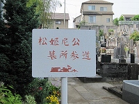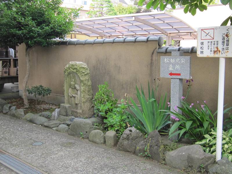 << 武田信玄公息女松姫君御手植ノ松−→市指定史跡「松姫尼公墓」 >> ● 武田信玄公息女松姫君御手植ノ松 ![]() ● 標識(←武田信玄公息女松姫さま墓所 観音堂右側) ![]() ● 標識(←松姫尼公墓所) ![]() ● 標識(松姫尼公墓所参道→) ![]() ● 市指定史跡「松姫尼公墓」 松姫尼公は、永禄四年(1561)武田信玄の四女(六女ともいう)として生まれ、七歳の時に織田信長の 長男信忠と婚約したが、その後、武田・織田両家が不和となってこの約束は果たされなかった。 天正十年(1582)武田氏滅亡の際、松姫は姪たち数人と八王子に逃れ、二十二歳の時、下恩方町の 曹洞宗心源院六世随翁舜悦ト山禅師のもとで出家し、後にこの地に庵を建て、信松院を開基した。 元和二年(1616)五十六歳で没。法名は「信松院殿月峰永琴大禅完尼」である。 令和2年3月31日 八王子市教育委員会 ![]() ![]() ![]() (画像をクリックすると大きくなります) ● (入口へ) ● |