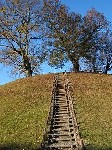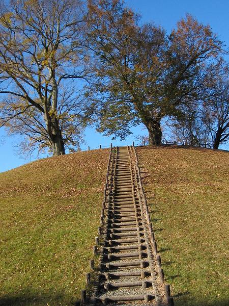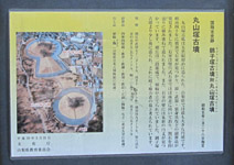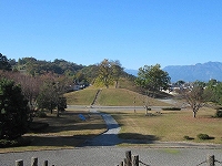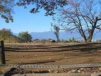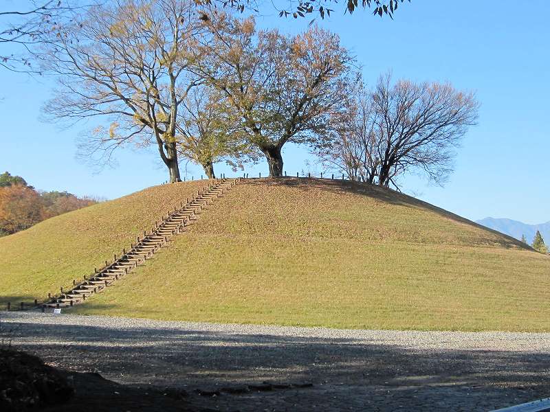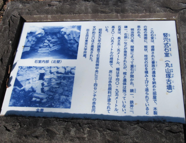 頂上は、広いです。 竪穴式石室(丸山塚古墳) この石室は、埋葬された豪族の遺体を納めた部屋で、木製の棺の周囲に、板状、柱状の 石を積み上げて造られていると思われる。 明治40年、開墾によって蓋石が開かれ、鏡1、鉄斧2、鎌1、石釧1などが発見されたが、棺 と遺体は残っていない。 石室は、長さ5.5メートル、幅は平均0.95メートル、高さ0.85メートルの規模で、床には赤色 顔料が塗られている。 昭和59年の調査で石室両側中央に3〜4センチの赤色円文が約30ほど発見された。 出土品は東京大学所蔵。